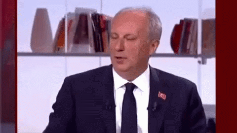 Turkish politician Muharrem Ince smiles brightly while speaking, wearing a suit and tie in front of a bookshelf.
