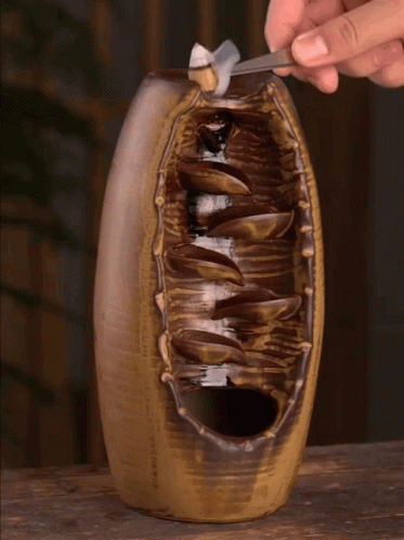 A hand places an incense cone into a ceramic backflow burner, creating a mesmerizing smoke waterfall effect.