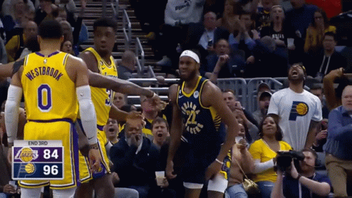 Indiana Pacers player Isaiah Jackson celebrates a basket during an NBA game against the Lakers, with the Pacers leading.