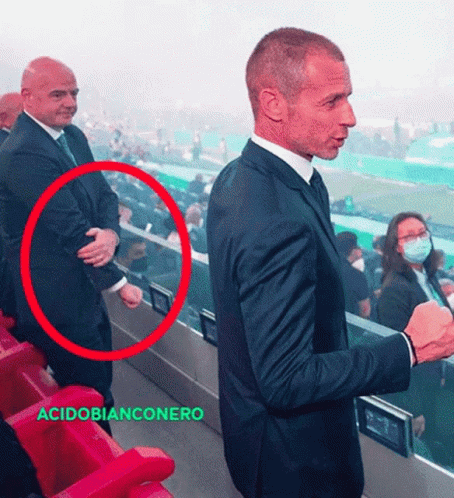 FIFA President Gianni Infantino and UEFA President Aleksander Čeferin at a stadium, with Infantino making the controversial umbrella gesture.