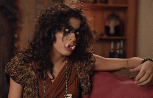 Maré, dressed in a fantasy costume with tusks and dark makeup, questions the source of information.