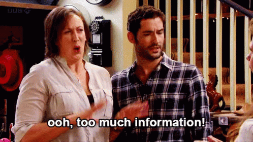 A woman reacts with a humorous 'ooh, too much information!' while standing next to a man.