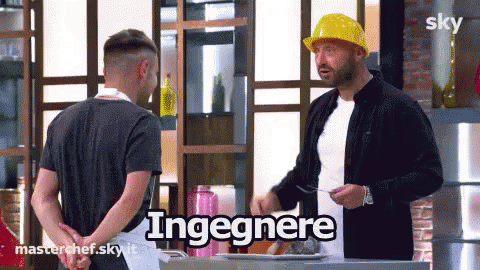 Joe Bastianich, wearing a yellow hard hat, addresses a contestant on Masterchef, jokingly calling him 'Engineer'.