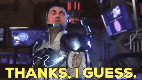 Blue Beetle (Jaime Reyes) from Injustice 2 says 'Thanks, I guess' in a tech-filled room.
