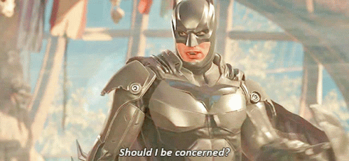 Batman from Injustice asks, 'Should I be concerned?' in his armored suit, looking directly at the viewer.