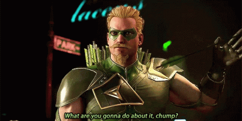 Green Arrow, also known as Oliver Queen, challenges with 'What are you gonna do about it, chump?'
