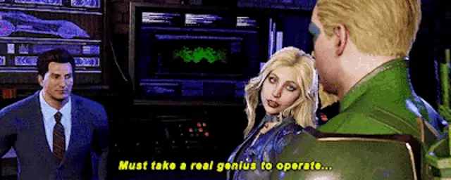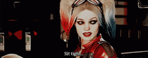 Harley Quinn from Injustice 2 delivers a playful warning, telling viewers to 'Sit tight...' in a dark setting.