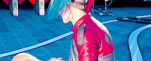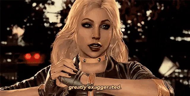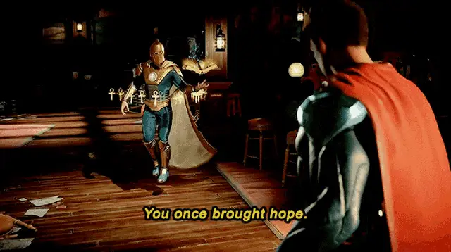 Harley Quinn from Injustice 2, with her iconic red and blue pigtails, says 'Sit tight...' in a game scene.
