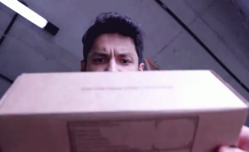 A man in a red shirt curiously inspects a cardboard box, looking for what's inside.