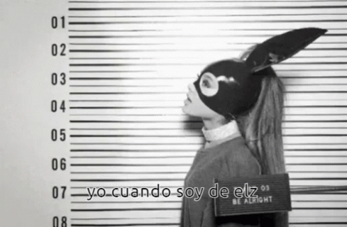 Ariana Grande in her iconic Dangerous Woman bunny mask, posing for a mugshot meme with Spanish text.