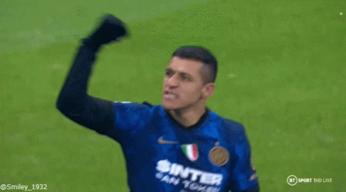 Alexis Sanchez, wearing his Inter Milan jersey, celebrates a goal with a raised fist on the field.