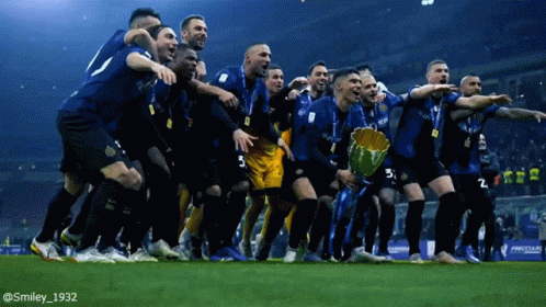 Inter Milan football team, including Joaquin Correa, celebrates a Supercoppa victory with a trophy.