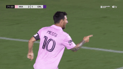 Lionel Messi celebrates a goal for Inter Miami CF, hugging teammate Josef Martinez on the field.