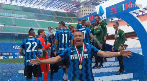 Alexis Sanchez celebrates Inter Milan's Scudetto victory with teammates, wearing his medal and cheering on the field.