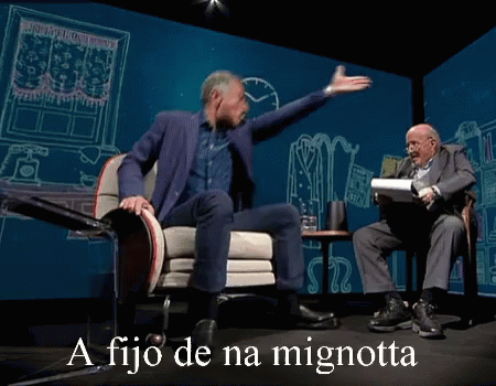 Paolo Bonolis passionately exclaims 'A fijo de na mignotta' during an interview, gesturing emphatically.