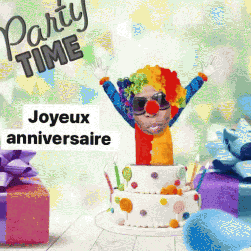 A fun birthday invitation for labergere and noura, featuring a clown on a cake with 'Party TIME' and 'Joyeux anniversaire'.
