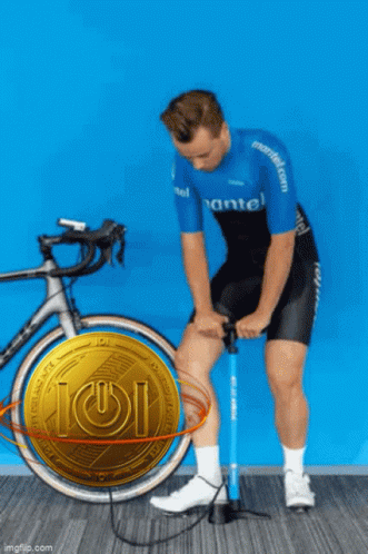 Man in a cycling jersey pumps a bicycle tire, with an IoiToken graphic on the wheel.