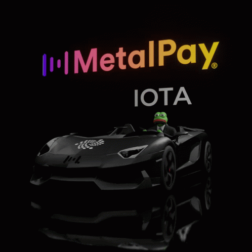 Pepe the Frog, dressed in a suit, drives a sleek black Lamborghini featuring IOTA and MetalPay logos.