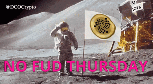 An astronaut on the moon salutes next to an IOTA flag, celebrating 'No Fud Thursday' for crypto enthusiasts.