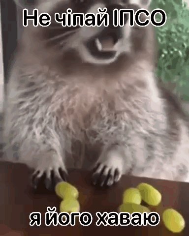 A raccoon eating grapes with a Ukrainian caption: 'Don't touch IPSO, I'm eating it.'
