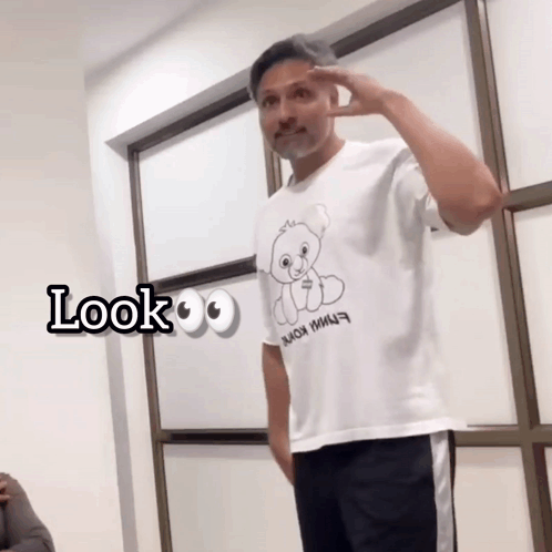 Iqbal Khan as Dev Raichand points and gestures, wearing a white t-shirt with a teddy bear design.