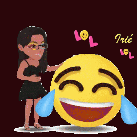 A cartoon girl, possibly Irie Lehie, in a black dress, laughing with a large emoji shedding tears of joy.