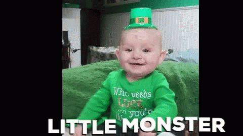 An adorable baby wearing a leprechaun hat smiles, with the caption 'LITTLE MONSTER' appearing on screen.