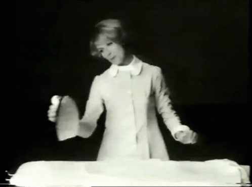 A woman in a white coat performs an 'Iron Dance' while ironing a shirt on a black background.