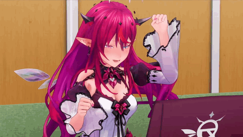 a girl with purple hair and horns is standing in front of a laptop