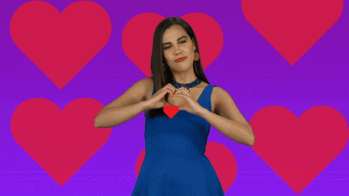 Paty ISATV expresses love by forming a heart shape with her hands against a vibrant heart-filled background.