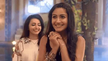 Ishqbaaaz's Annika shows an excited reaction, smiling widely with another woman in the background.