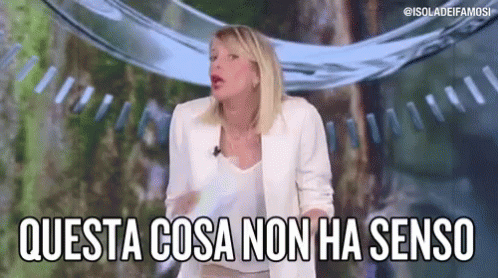 Alessia Marcuzzi on stage, expressing frustration with the phrase 'Questa cosa non ha senso' from Isola dei Famosi.
