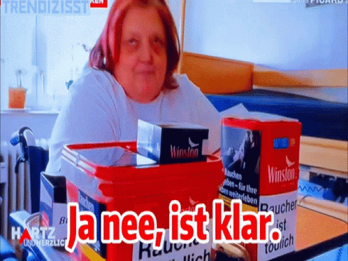 Gudrun sits with Winston cigarettes, uttering the sarcastic German phrase 'Ja nee, ist klar.'