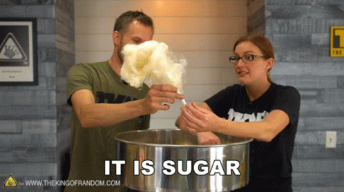Nate and Calli from The King of Random make cotton candy, with the text 'IT IS SUGAR' displayed.