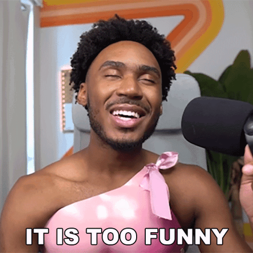 A man in a pink one-shoulder top laughs and exclaims, 'It is too funny, I love it!'