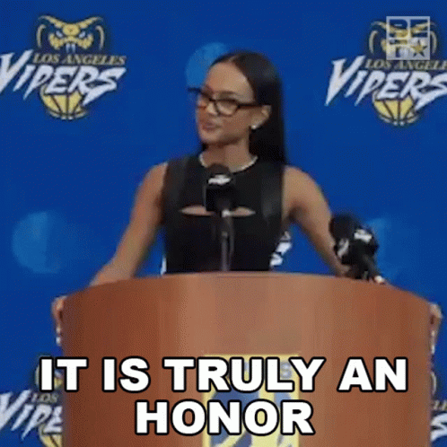 Eden Lazlo speaks at a podium, expressing gratitude with 'It Is Truly An Honor' text displayed.