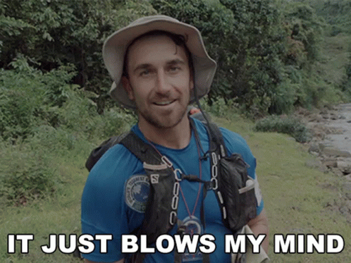 A man in a hat and blue shirt expresses his amazement, saying 'It just blows my mind' during the Worlds Toughest Race.