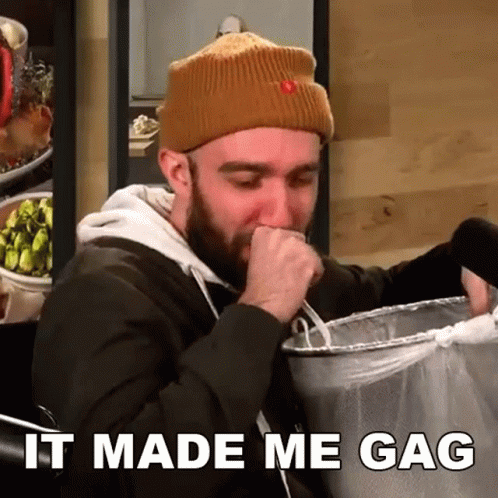 Dan from H3 Podcast reacts strongly, gagging into a trash can during a segment.