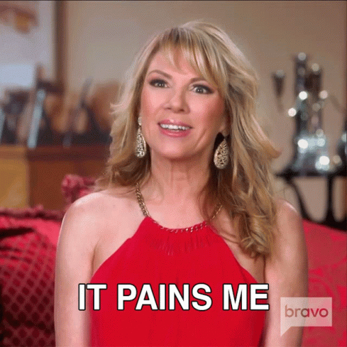 Ramona Singer from Real Housewives of New York expresses 'It Pains Me' in a red dress.