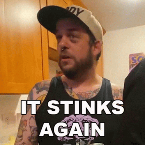 Doodybeard, wearing a hat and tank top, exclaims 'It Stinks Again' in a kitchen setting.