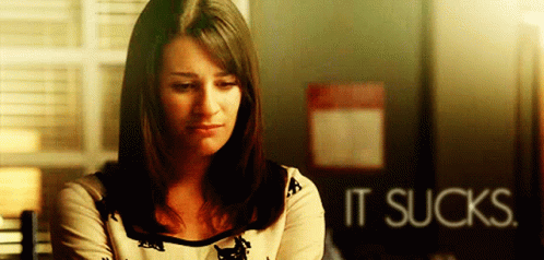 A woman with a sad expression, with the words "IT SUCKS" visible in the background.