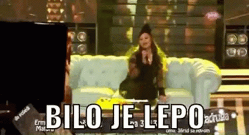 A woman sits on a white couch on a stage, singing into a microphone, with the text 'BILO JE LEPO' on screen.