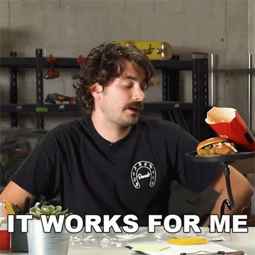 James Pumphrey looks at a hamburger and fries, stating 'It Works For Me' in a relatable moment.