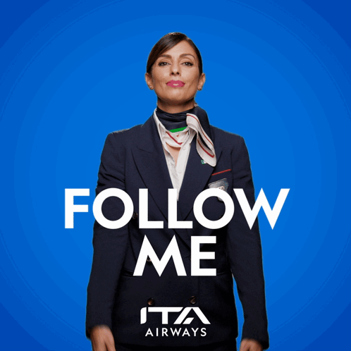 An ITA Airways flight attendant gestures 'Follow Me' against a vibrant blue background, inviting viewers.