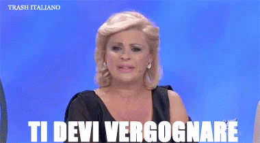 Tina Cipollari, a well-known personality from Italian TV, passionately exclaims "Ti devi vergognare" (You should be ashamed).