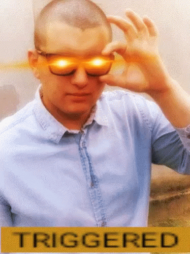 Man with glowing eyes behind sunglasses, wearing a blue shirt, with 'TRIGGERED' text on screen.