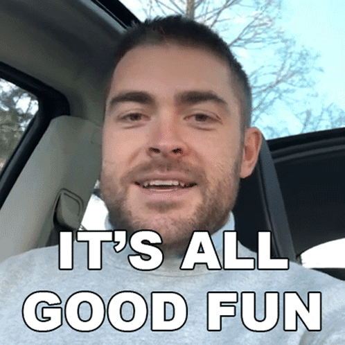 Lewis Jackson in a car, with the text 'IT'S ALL GOOD FUN' displayed, sharing a lighthearted moment.