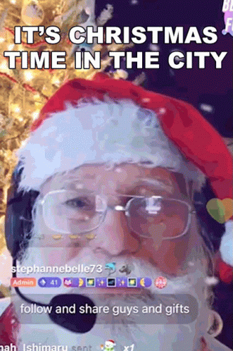 A man dressed as Santa Claus, reminiscent of Bobby Helms' song, wishes 'It's Christmas Time in the City' during a live stream.