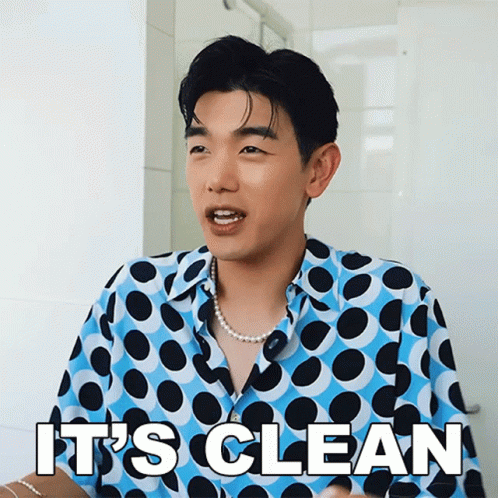 Eric Nam, wearing a blue and black polka dot shirt, enthusiastically declares "It's clean, it's fresh!"