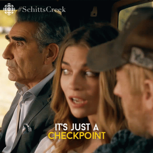 Alexis Rose and others in a car, discussing checkpoints, with Alexis mentioning Johannesburg.